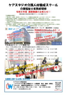 <ケアスタジオ介護人材スクール開校> 介護福祉士実務者研修コース5月講座(日曜日開催)が開講いたしました。新川圏域内でのスクーリング開催は当社講座が唯一となります。年間2クラスで集合研修が毎回日曜日開催の5月コースと毎回 […]
