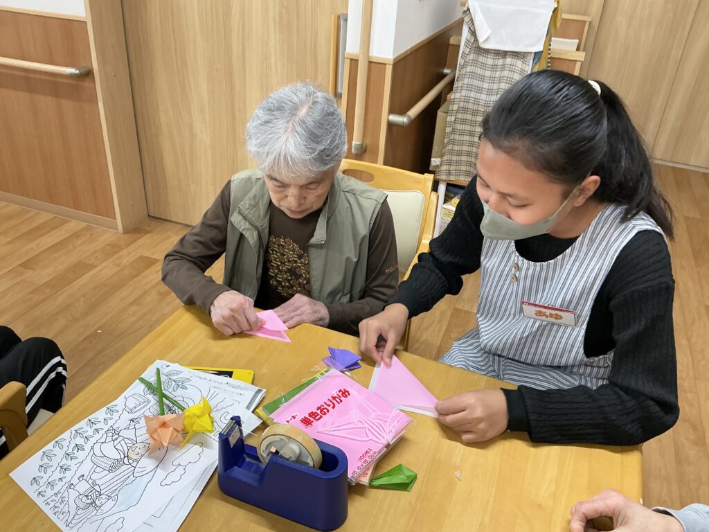 利用者さんから折り紙を教わるアユさん